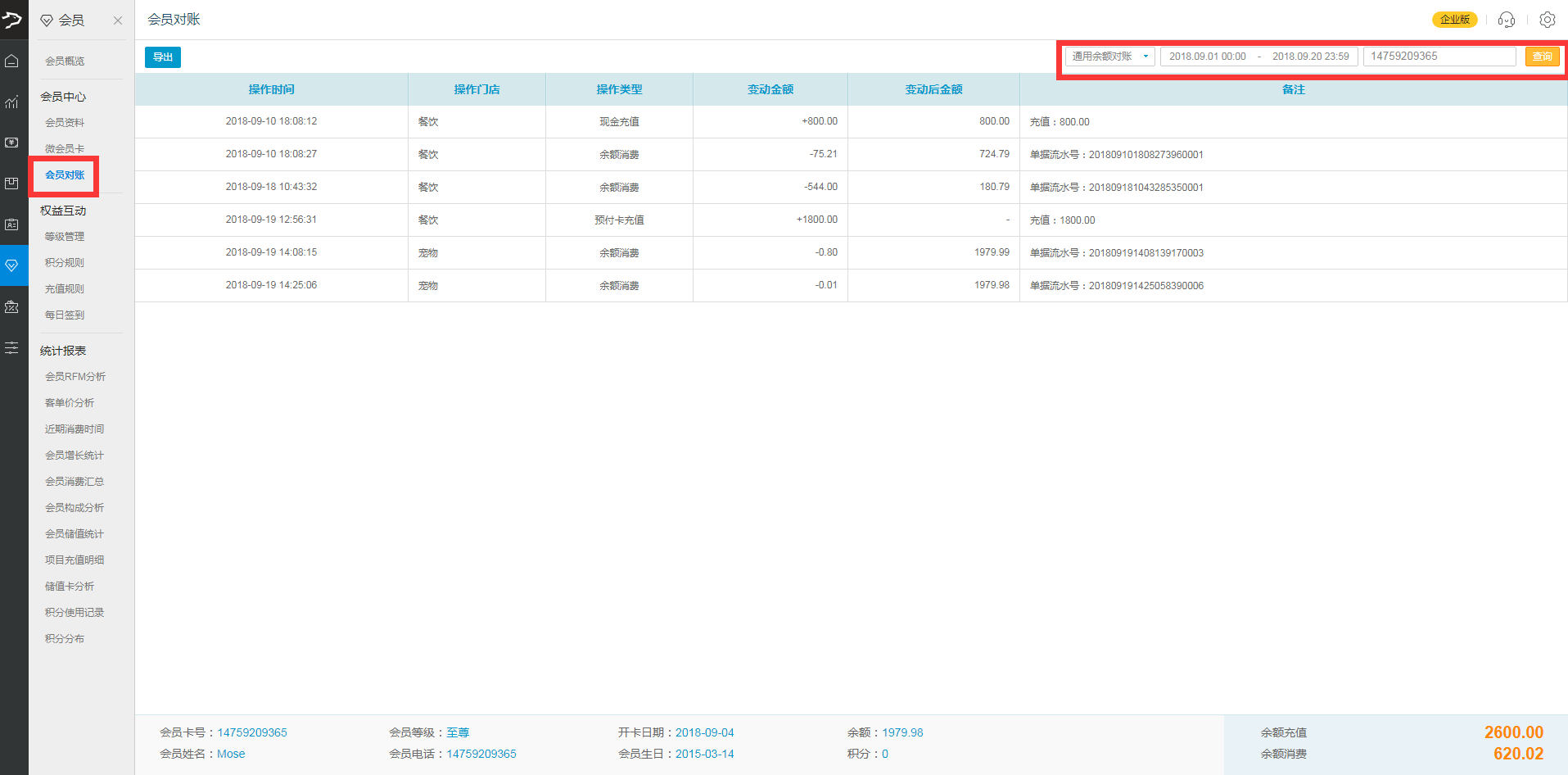 - 报表位置:云后台-会员-会员资料-会员对账-筛选历史消费单据