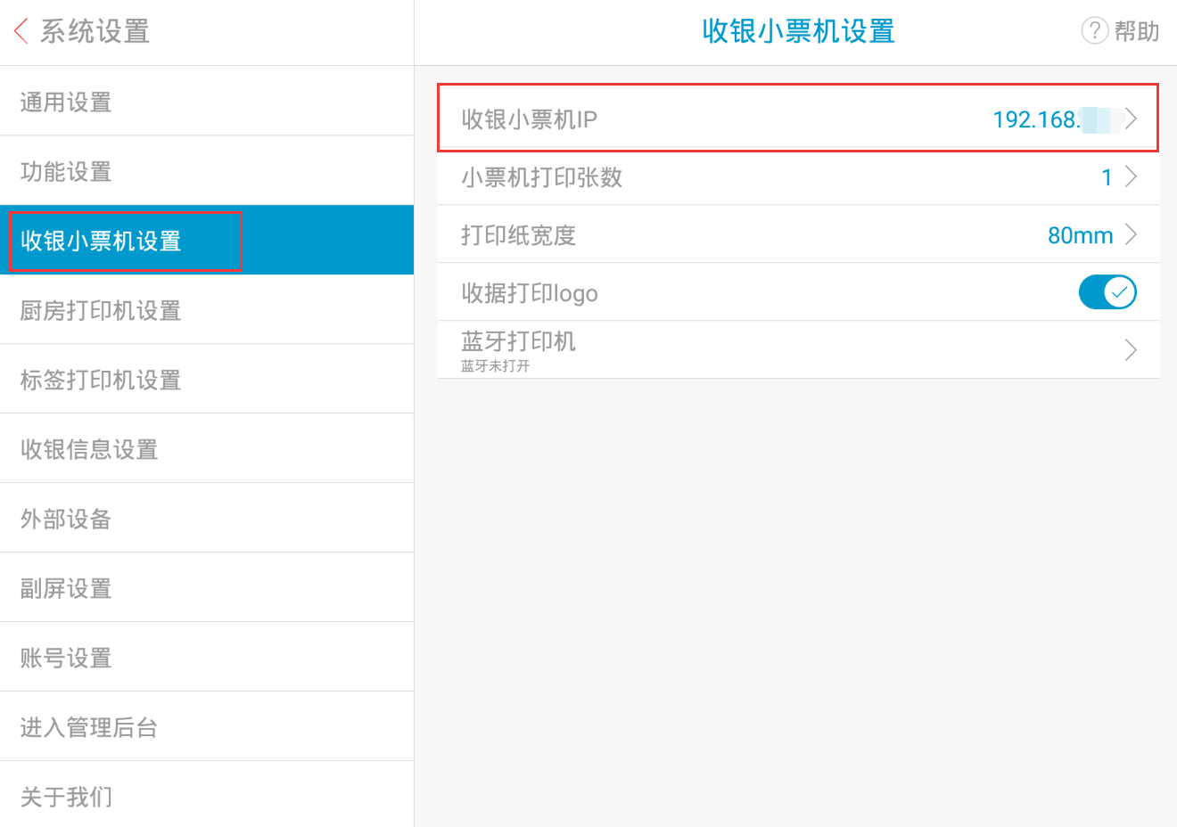 打开收银端-->左上角功能菜单-->系统设置-->功能设置-->本机ip:192.168.xx.xx