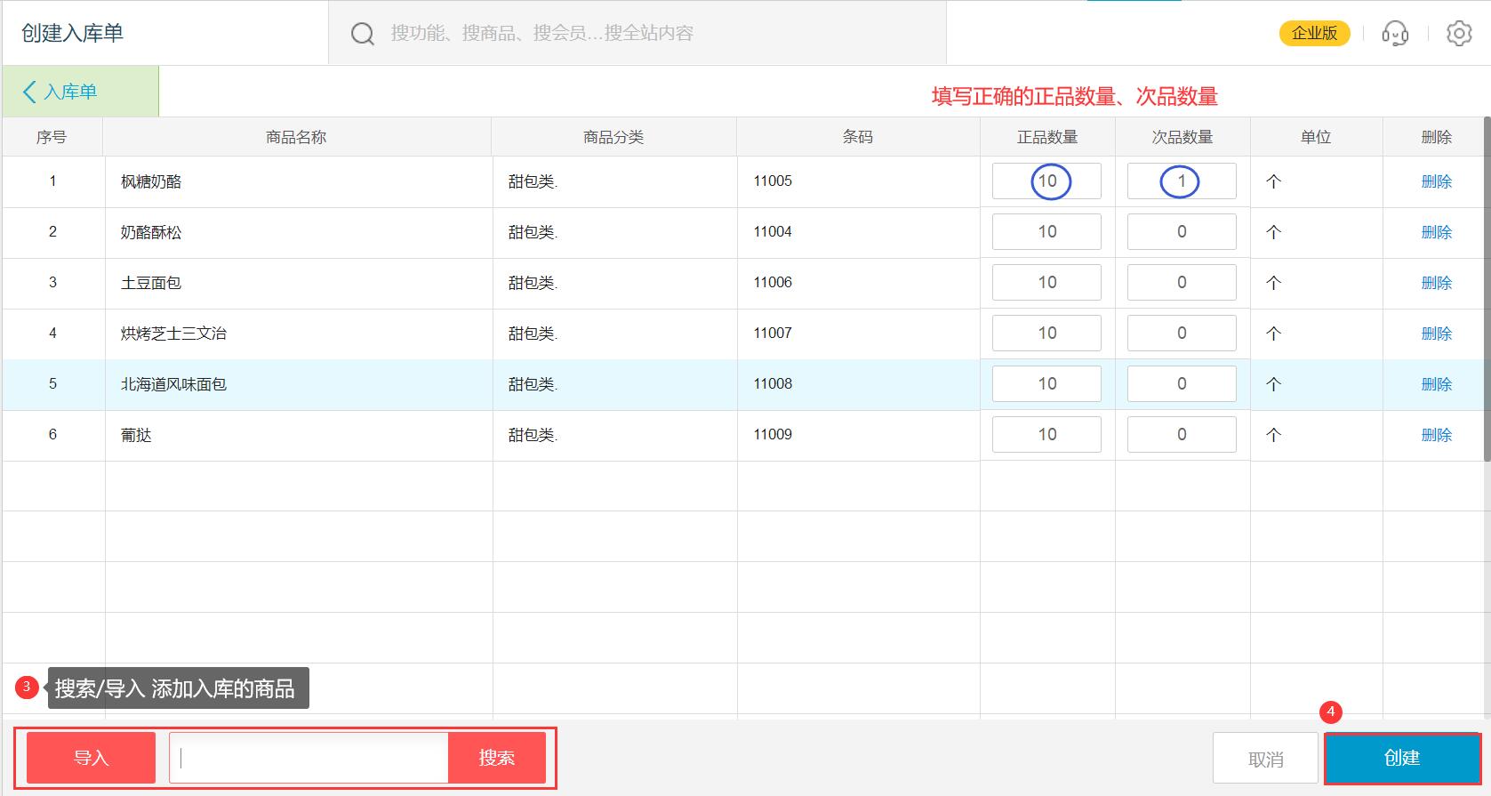搜索/导入 添加入库的商品,填写正确的正品数量、次品数量,点击【创建】