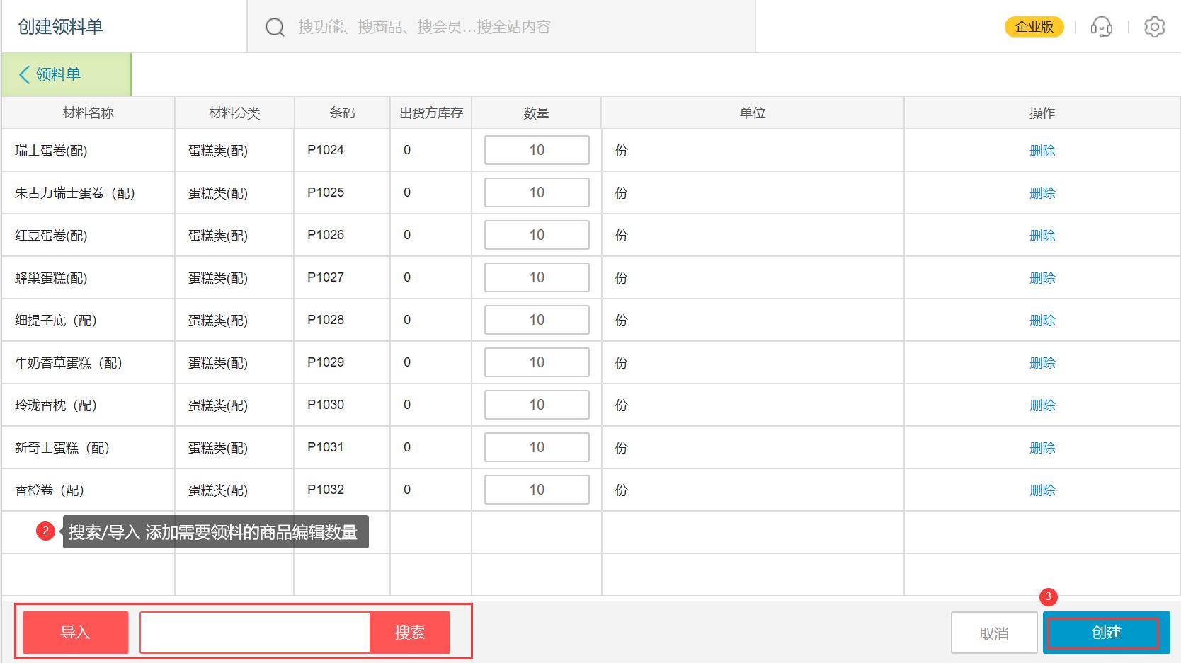 搜索/导入 需要领料的商品,编辑数量,填写好后点击【创建】即完成;