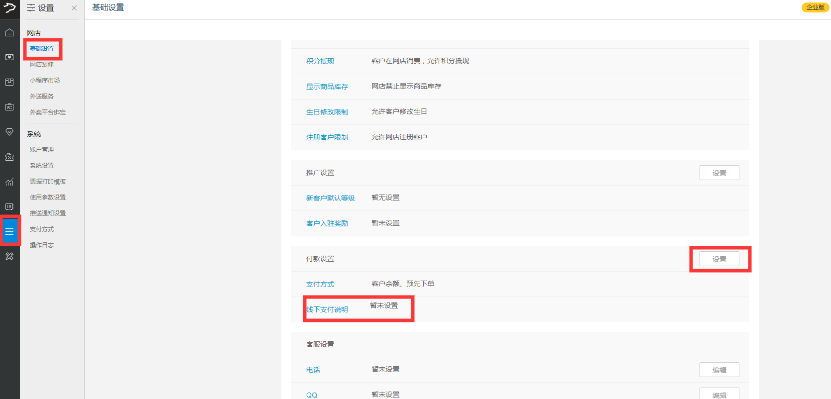 操作路径:设置 > 网店 > 基础设置>付款设置>添加线下支付说明