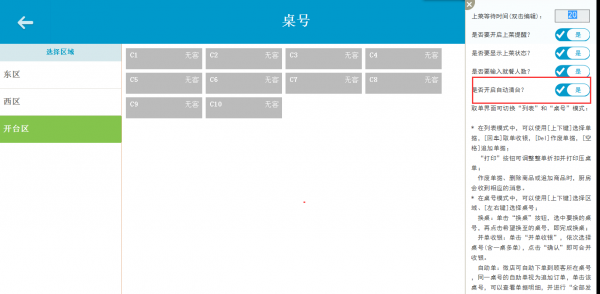 针对就餐完再结账的餐厅,希望收完银后原来开台的桌号会自动清空,我们可以把这个自动清台的功能开启,点击桌号管理或者取单界面右上角的帮助按钮,开启自动清台功能,如图: