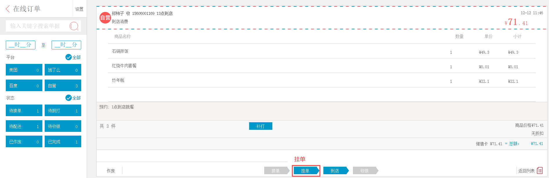 7.如果桌位不紧张,可以等客人到店后搜索网单再挂单到桌上,厨房出厨打单,开始做菜;如果当天用餐高峰期,客人多,可以给该客人开台预留桌位配合开台功能使用;