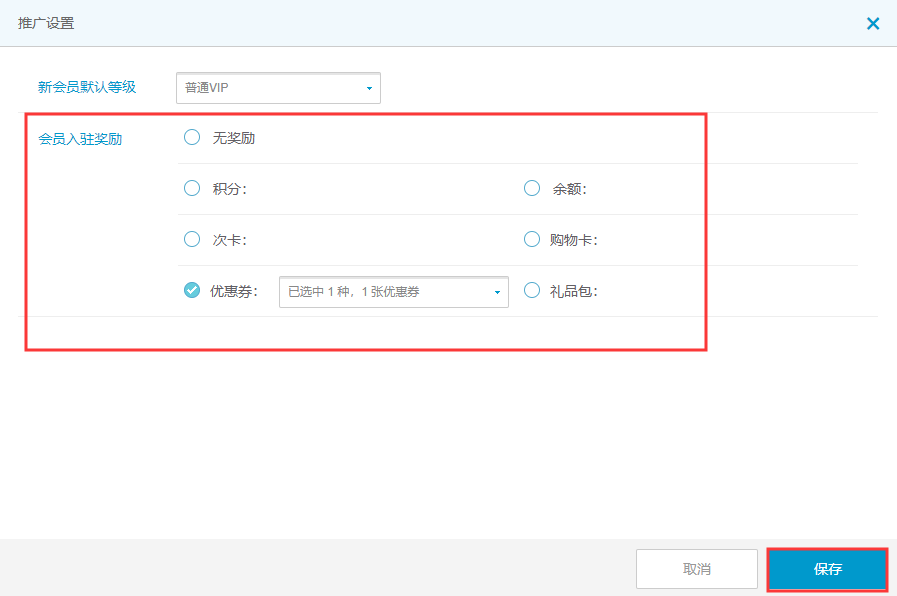 点击【设置】--【网店】--【基础设置】--【推广设置】--【会员入驻奖励】选择奖励项目【优惠券】选中对应优惠券点击保存即可