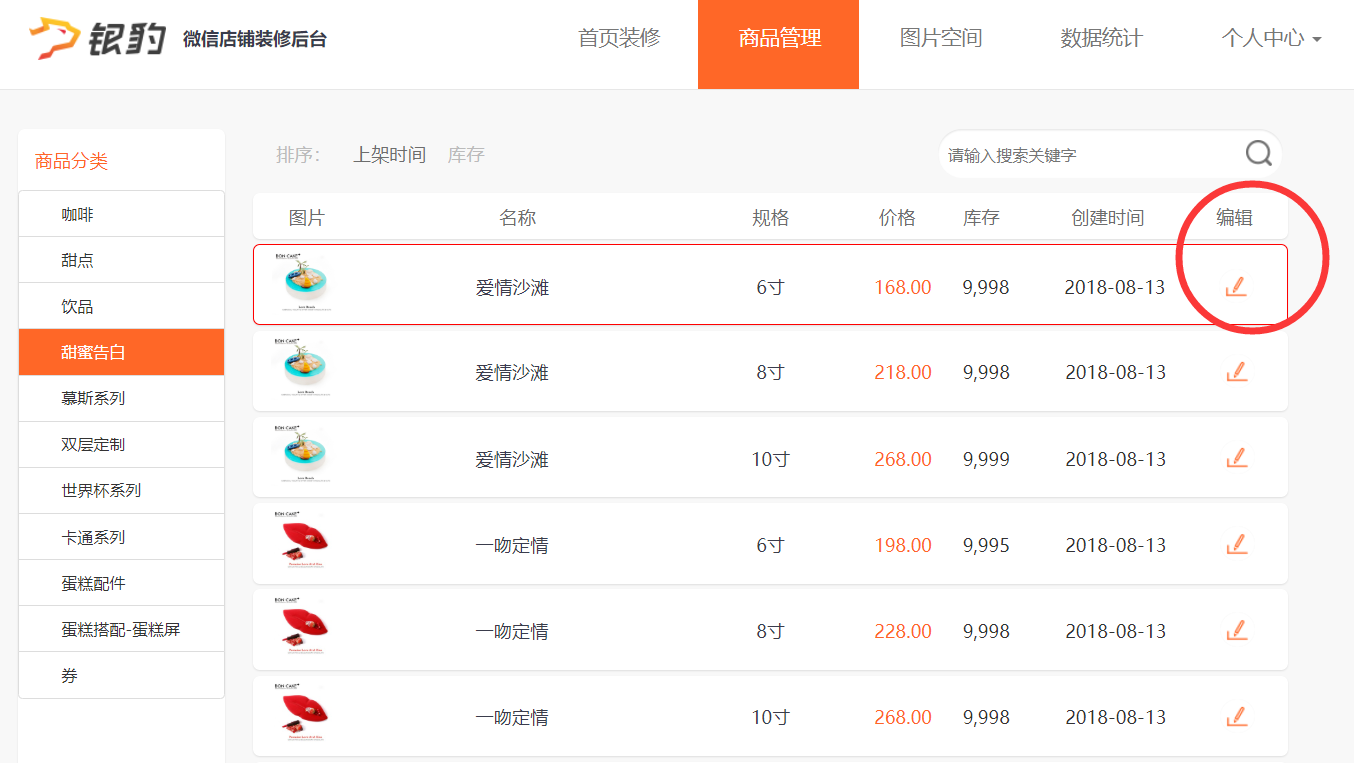点击商品分类,选择商品,点击【编辑】(多规格商品只需设置主商品详情即可)