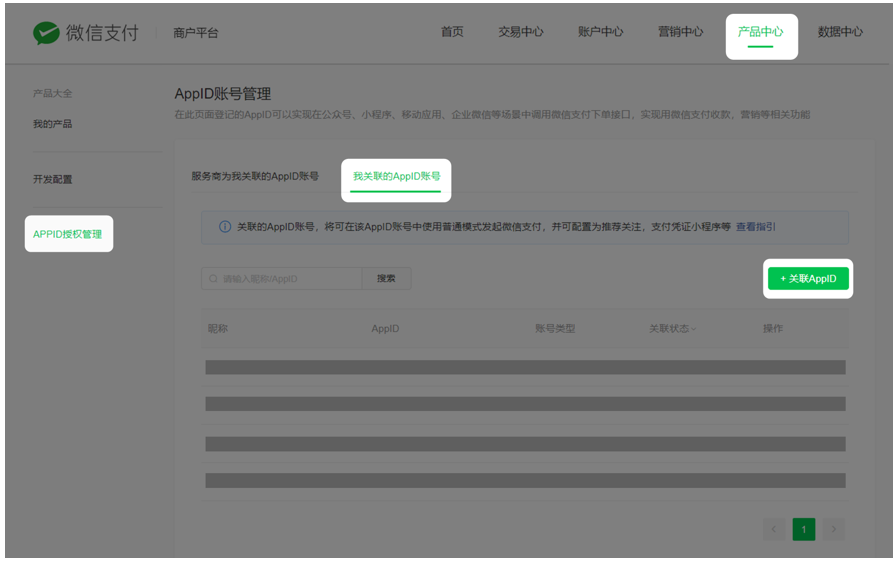 登录微信支付商户平台 (产品中心 → AppID账号管理 → 关联AppID→ 授权绑定的AppID)