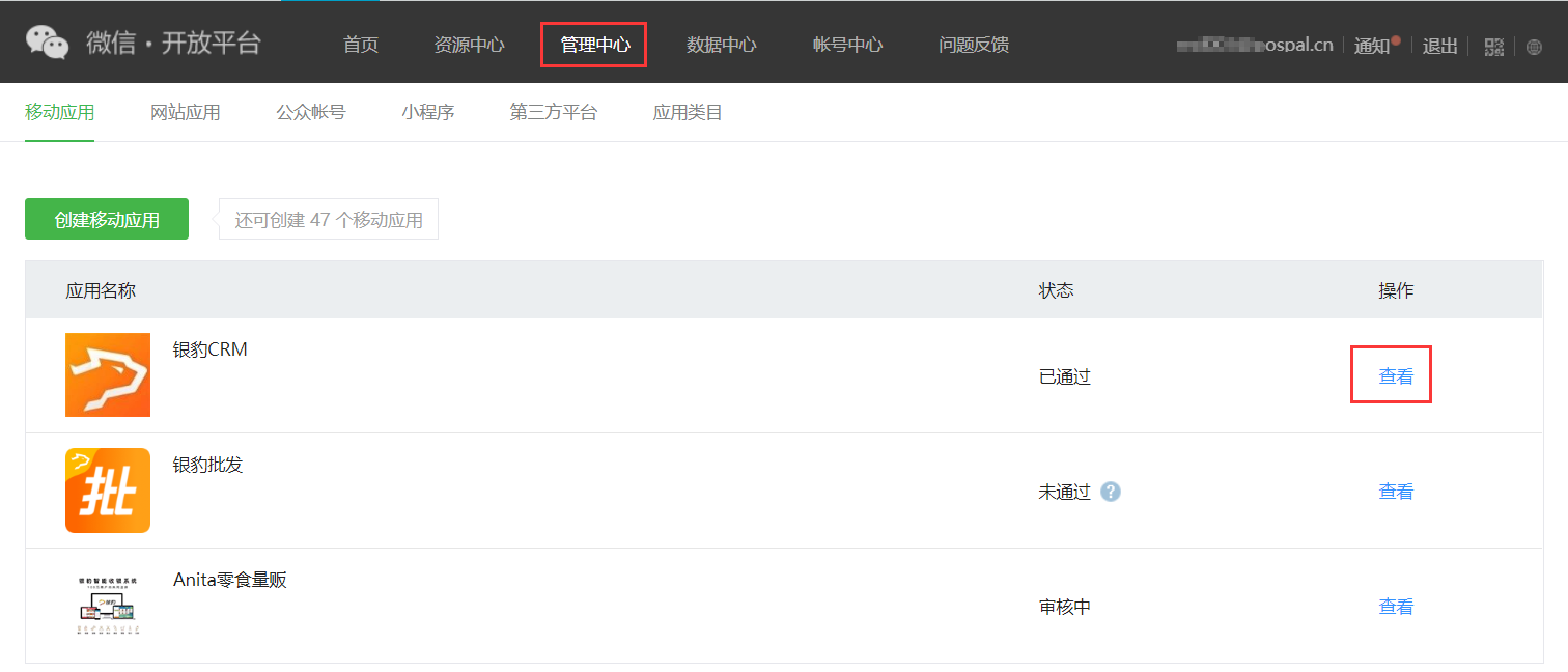移动应用审核通过后,登录微信开放平台(管理中心—移动应用—查看)