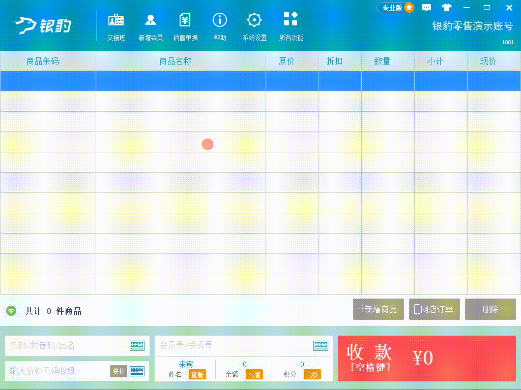 1)打开银豹收银系统—登陆注册升级好的银豹账号及密码—选择所属行业—登陆收银员工号(默认工号密码为1001);