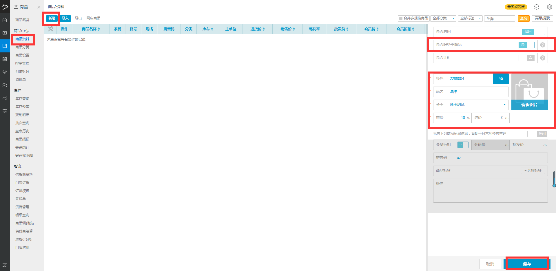 1.【商品-商品资料】,点击左上角新增按钮,开启服务类商品(服务类商品无库存)