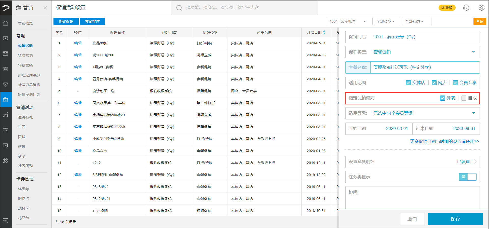 商家可根据门店经营场景在云后台创建促销活动时,可指定促销模式,可选外卖/自取 路径:云后台,营销-常规-促销活动 注意:创建促销活动,适用范围可选实体店/网店/会员专享,其中网店是指银豹线上商城(微店/小程序),不包含第三方外卖平台; 示例:创建套餐营销活动,买爆浆鸡排送可乐,指定促销模式:外卖 场景演示