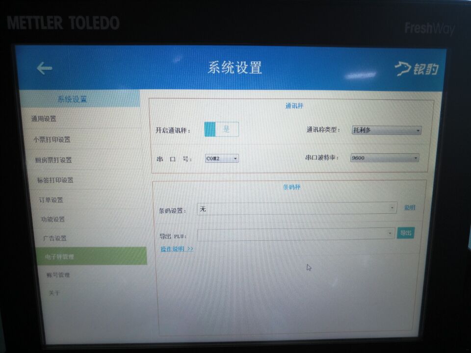 4. 登录前台后,设置--电子秤管理 开启通讯秤,选择托利多,串口号默认COM2(不行换其他COM),波特率9600,设置好,返回收银界面;
