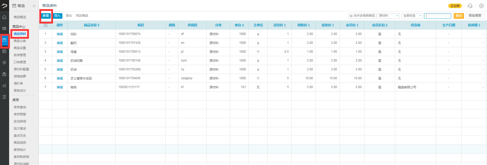 (1)新增原材料商品:奶油奶酪,奶油,鸡蛋,酸奶,低粉5个商品资料;